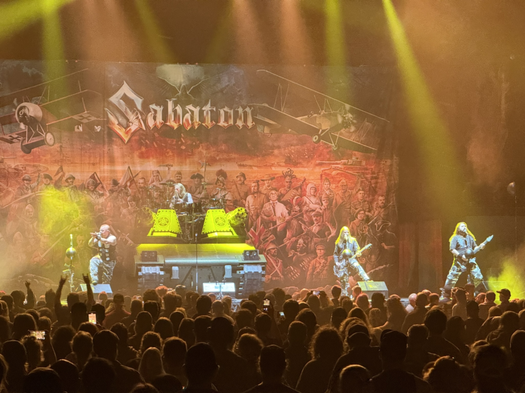 Sabaton live performance concert band stage crowd war imagery spotlights music