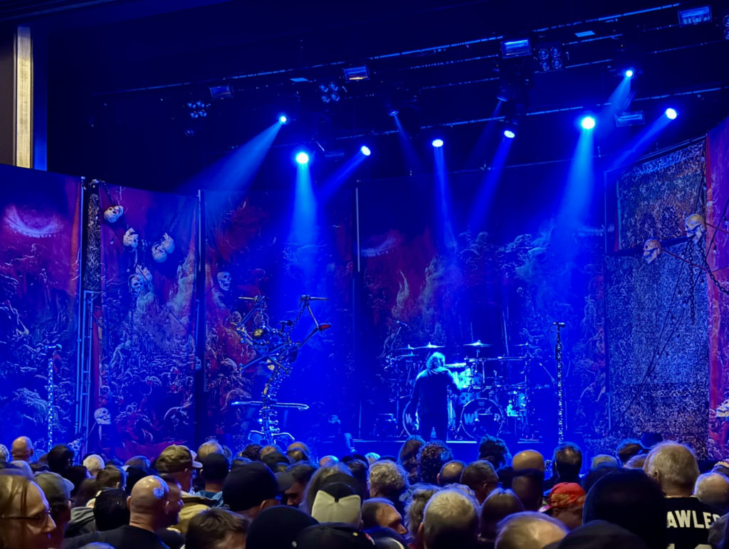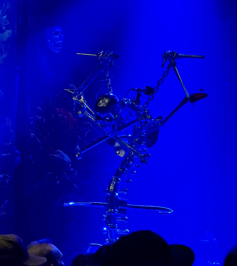 concert live music stage stage lights blue lighting band rock band performance drummer audience crowd venue skulls artwork macabre dark music event