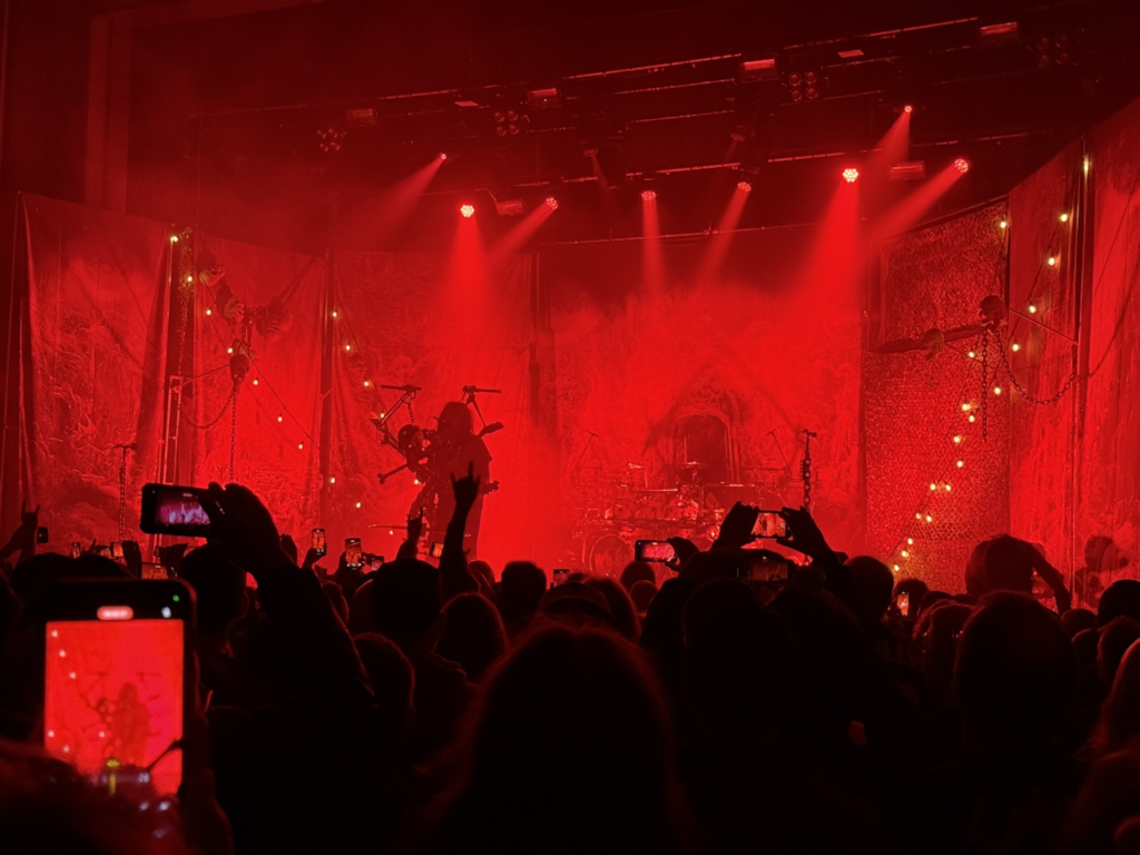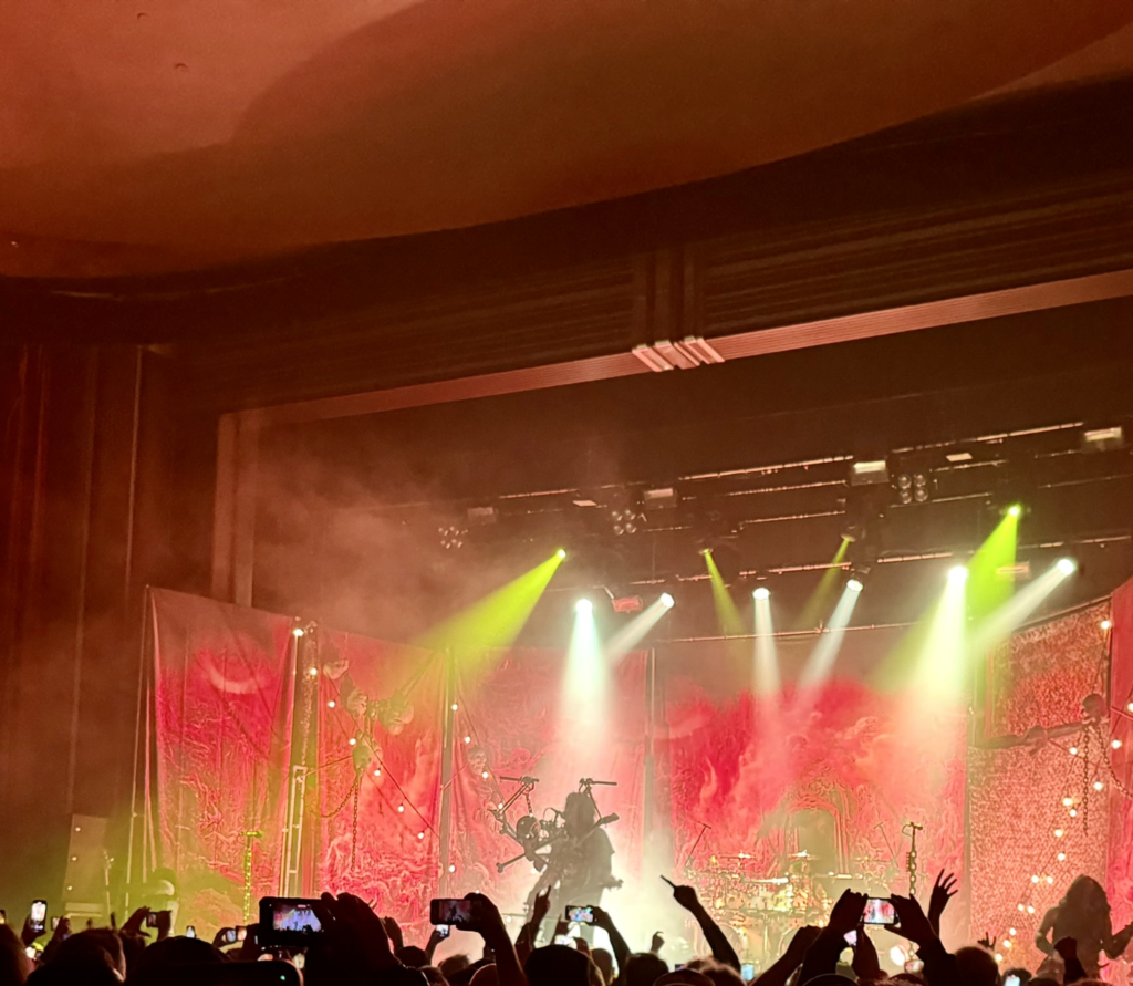 A view from the audience at a concert, with the stage bathed in intense red lighting. The crowd is silhouetted, many holding up phones to record the performance. The stage backdrop includes hanging chains, skulls, and draping fabric.