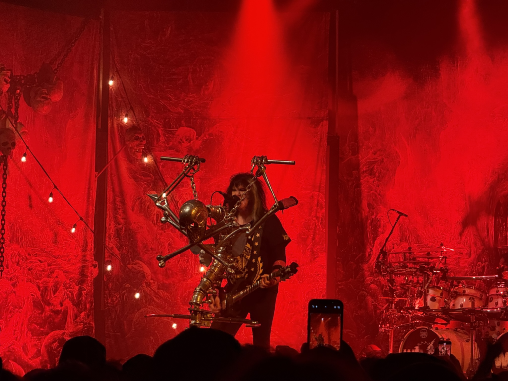 A concert scene bathed in red light features a guitarist at center stage, adorned with a unique, skeletal-mechanical instrument. The backdrop is a draped banner decorated with skulls and grotesque figures, illuminated by string lights along the edges. To the right, a visible drum set completes the stage setup, while the foreground captures the silhouettes of the audience, with some phones pointed towards the stage, recording the performance.