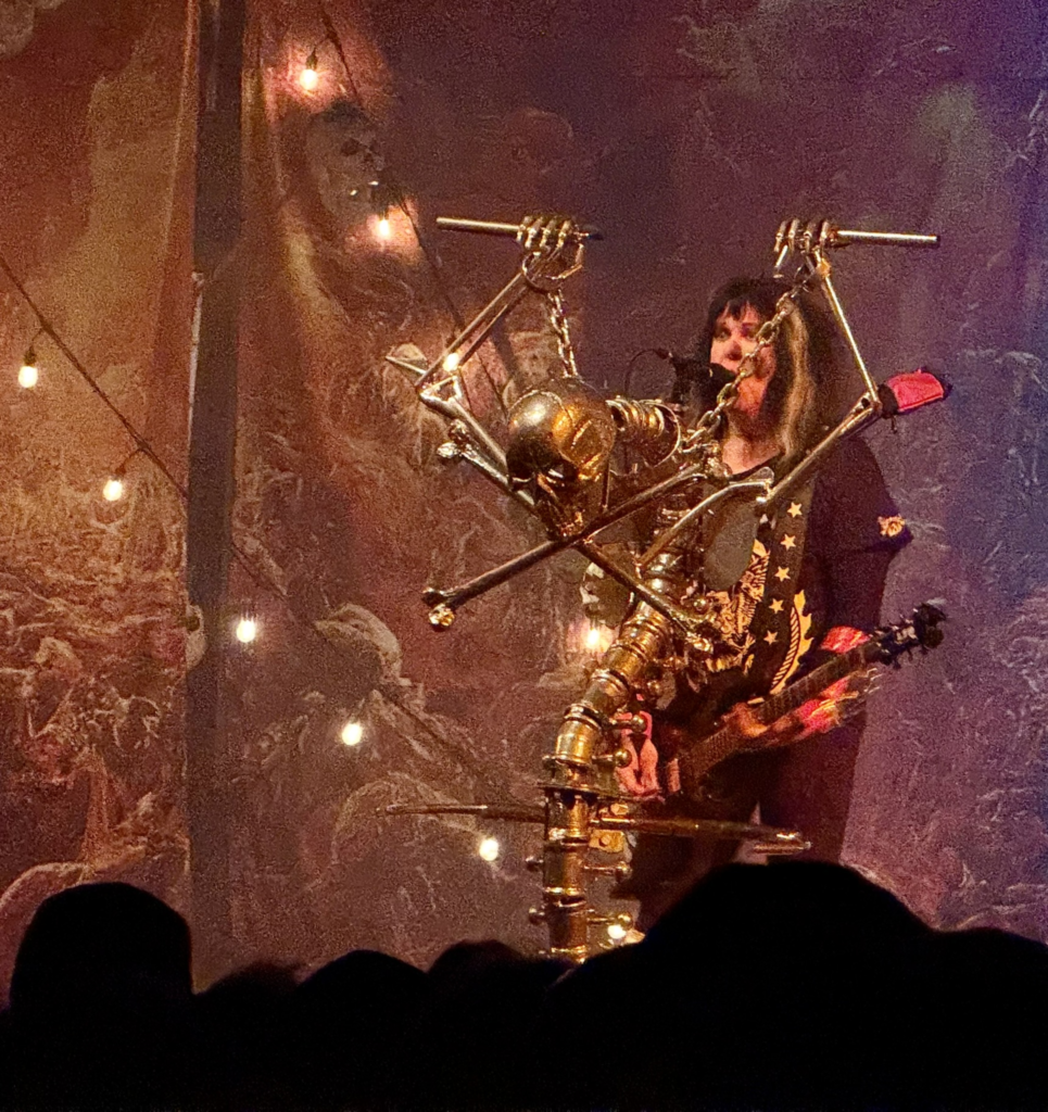 live performance stage lights rock concert heavy metal crowd music performer skeleton skull fan horns hand gesture