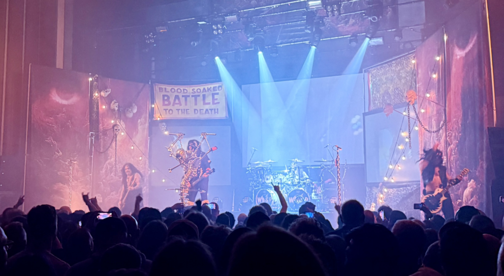 A wide, low-angle shot capturing a live concert scene with a heavy metal band performing on stage in front of a large crowd. The stage setup includes dramatic backdrops, a banner reading 'BLOOD SOAKED BATTLE TO THE DEATH,' and intense lighting, including spotlights shining down on the band. Band members are playing instruments and engaging with the audience, who are shown cheering and raising their hands. The foreground features the silhouettes and partial views of the concert attendees, many holding up their phones to capture the performance. The overall atmosphere is energetic with a dark, somewhat theatrical aesthetic typical of heavy metal concerts.