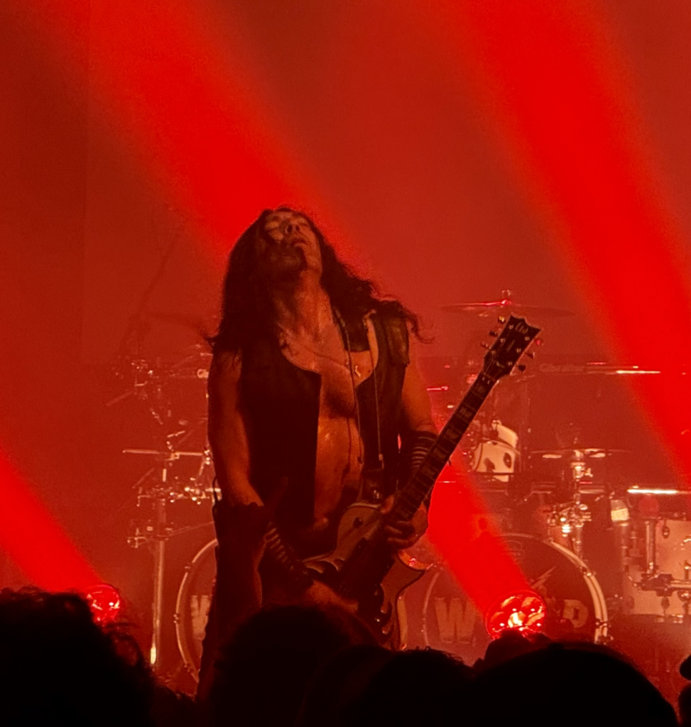 A photo captures a live performance by W.A.S.P., with lead singer Blackie Lawless center stage, illuminated by blue light. The stage decorations include skulls, chains and a backdrop that creates a spooky atmosphere enhancing the heavy metal concert experience.